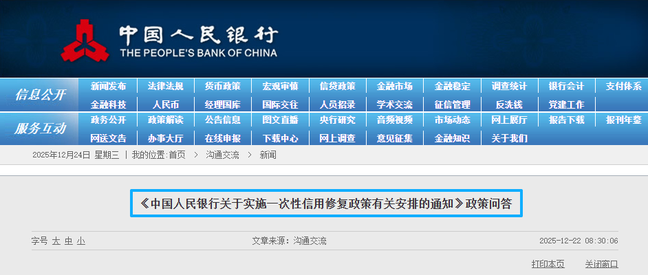 12月22日,为支持信用受损但积极还款的个人高效便捷重塑信用,助力经济持续向好,中国人民银行发布《中国人民银行关于实施一次性信用修复政策有关安排的通知》,明确央行征信系统(金融信用信息基础数据库)对符合条件的个人逾期信息作不予展示处理。