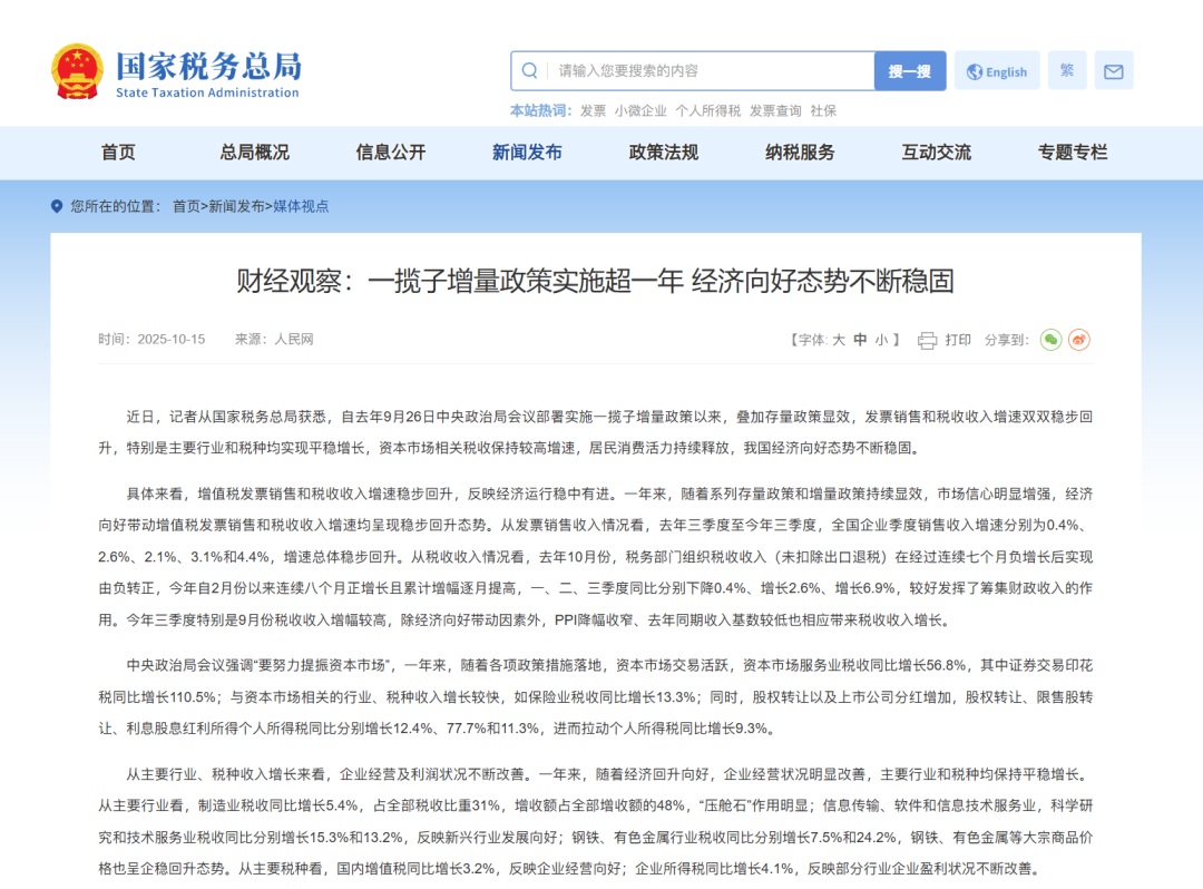 近日,从国家税务总局获悉,自去年9月26日中央政治局会议部署实施一揽子增量政策以来,叠加存量政策显效,发票销售和税收收入增速双双稳步回升,特别是主要行业和税种均实现平稳增长,资本市场相关税收保持较高增速,居民消费活力持续释放,我国经济向好态势不断稳固。