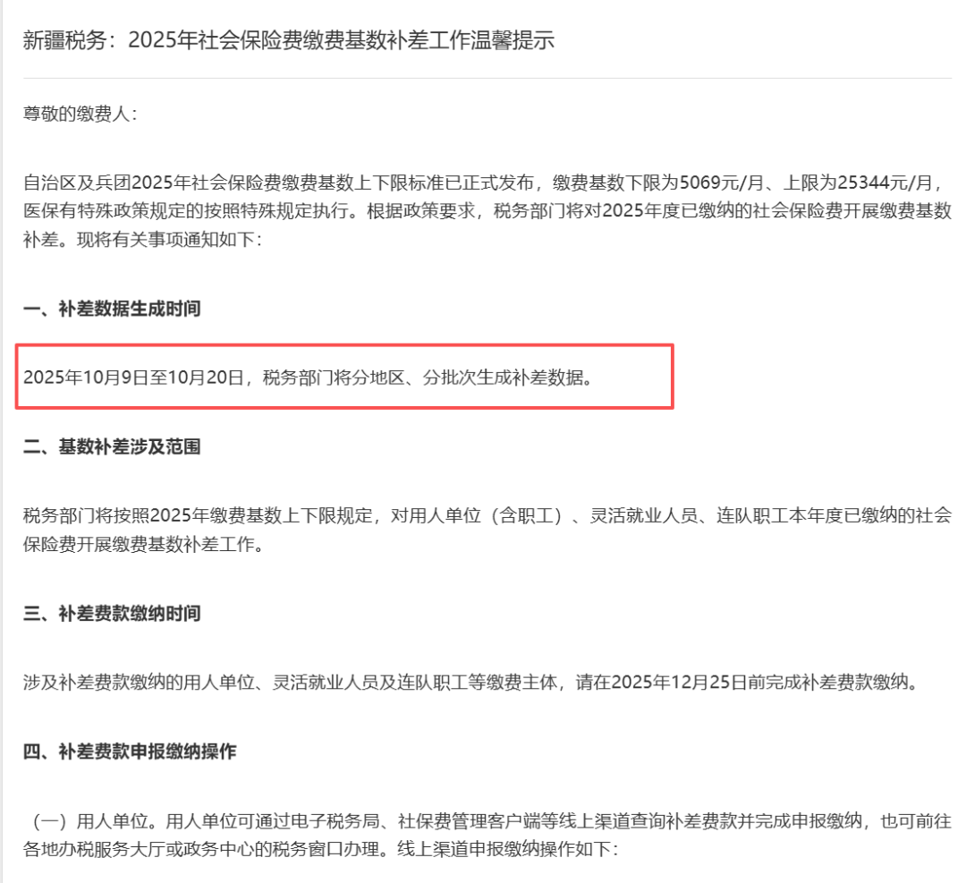 2025年10月9日至10月20日,税务部门将分地区、分批次生成补差数据。