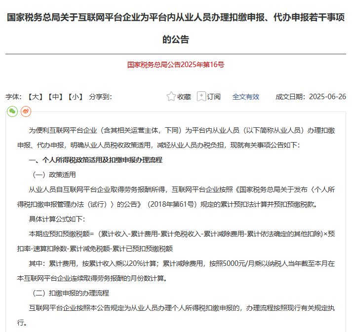 除个人所得税外,《公告》还细化了增值税及附加税费代办申报相关规定,从业人员自互联网平台企业取得的服务收入可按规定享受增值税小规模纳税人月销售额10万元以下免征增值税等税费优惠政策,不需再按次申报缴纳增值税,进一步减轻了平台从业人员的税收负担。