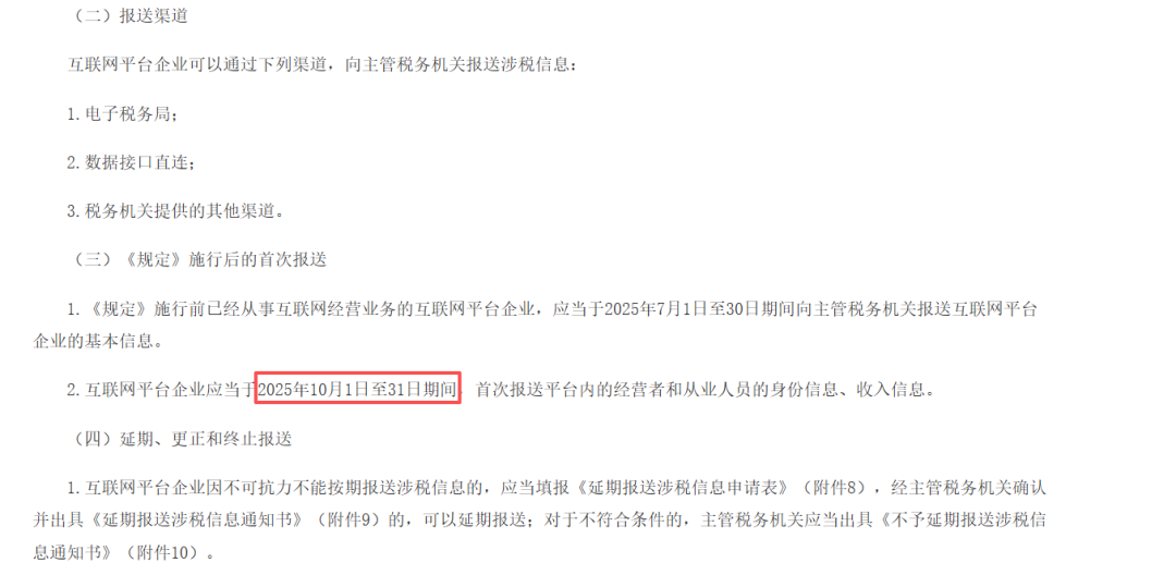 今年10月1日起,按照国务院发布的《互联网平台企业涉税信息报送规定》有关要求,互联网平台企业将首次正式报送平台内经营者和从业人员的身份信息、收入信息。