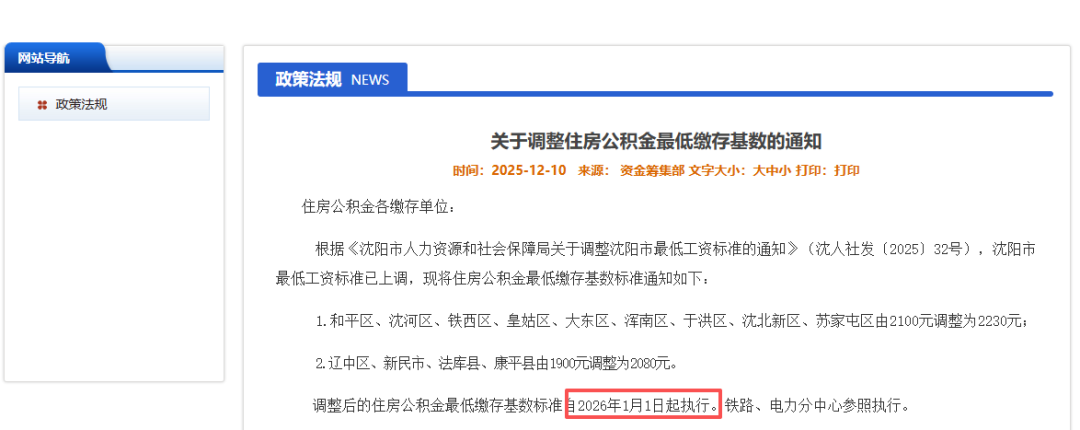 调整后的住房公积金最低缴存基数标准自2026年1月1日起执行。铁路、电力分中心参照执行。