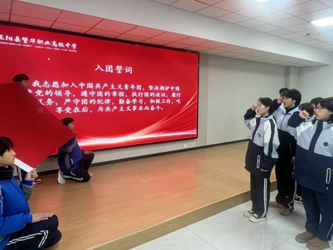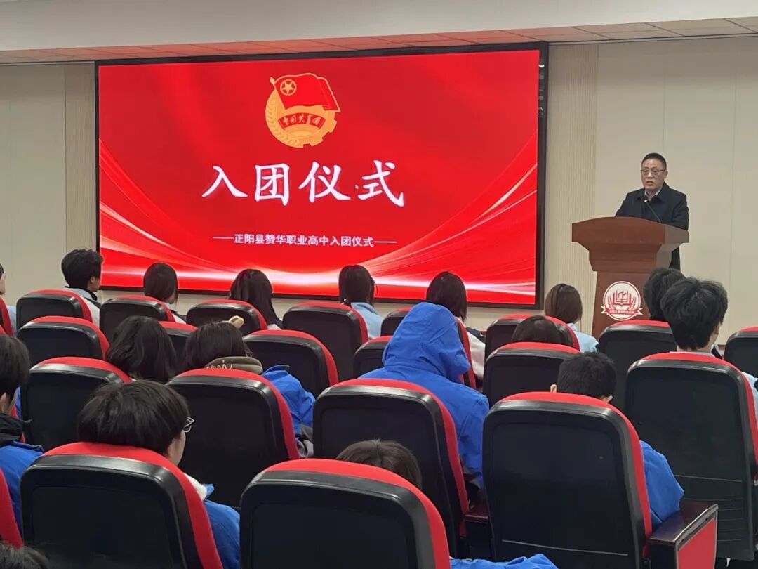 12月25日,正阳县赞华职业高中庄严举行“青春向党 技能报国”2025年新团员入团仪式。校长李保龙、政教处主任高弘琛、校团委书记王旭出席活动,共同见证24名优秀学子光荣加入中国共产主义青年团。