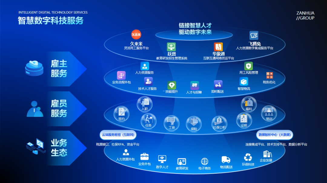 赞华集团依托技术创新重塑服务流程、提升服务品质,旗下自主研发的数字化平台体系覆盖用工管理、人力协同、物流保障与教育支撑等关键环节:“久来米”共享经济灵活用工平台以弹性模式助力企业降本增效,灵活响应多样化用工需求;“飞腾兔”人力资源数字集成平台通过一体化数据整合,为企业提供高效、透明的人力资源管理服务;“华象通”互联互通网络货运平台依托智能调度与网络优化,切实降低企业运营中的物流成本;而“跃贤”教育招生管理系统则以智能化工具赋能教育机构,实现招生流程优化与资源高效配置。
