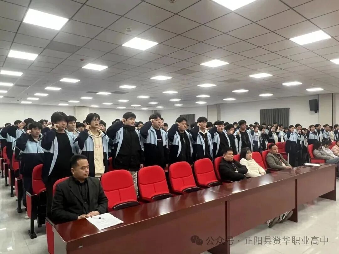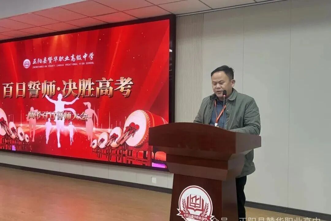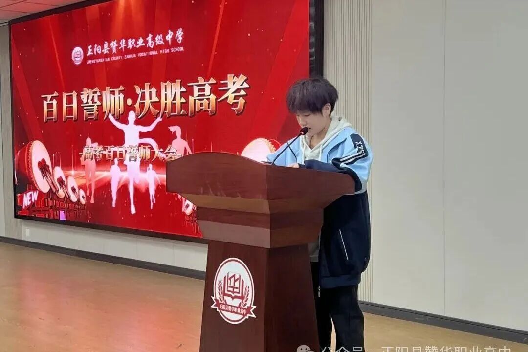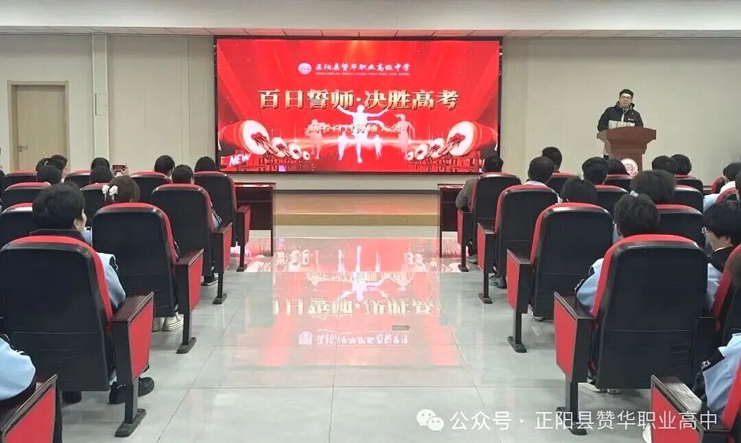 号角催征,为梦起航!在庄严的国歌声中,正阳县赞华职业高中“高考百日誓师大会”于2025年11月18日隆重举行。全校师生齐聚报告厅,共同见证这一庄严时刻,为高三学子凝聚力量、点燃斗志,拉开百日冲刺的序幕。