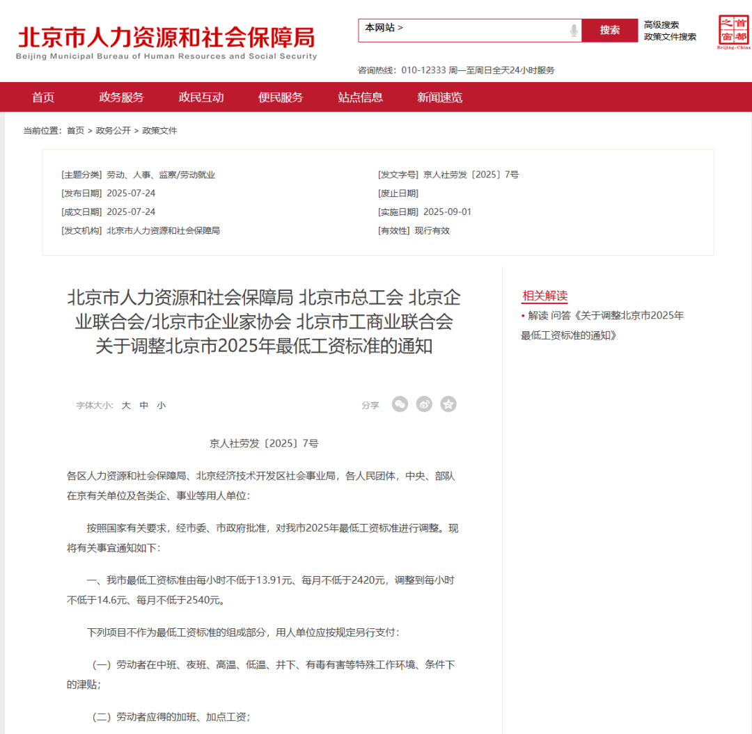 北京市最低工资标准由每小时不低于13.91元、每月不低于2420元,调整到每小时不低于14.6元、每月不低于2540元。