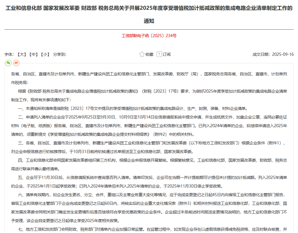 根据《财政部 税务总局关于集成电路企业增值税加计抵减政策的通知》(财税〔2023〕17号)要求,为做好2025年度享受加计抵减政策的集成电路企业清单制定工作,现将有关事项通知如下: