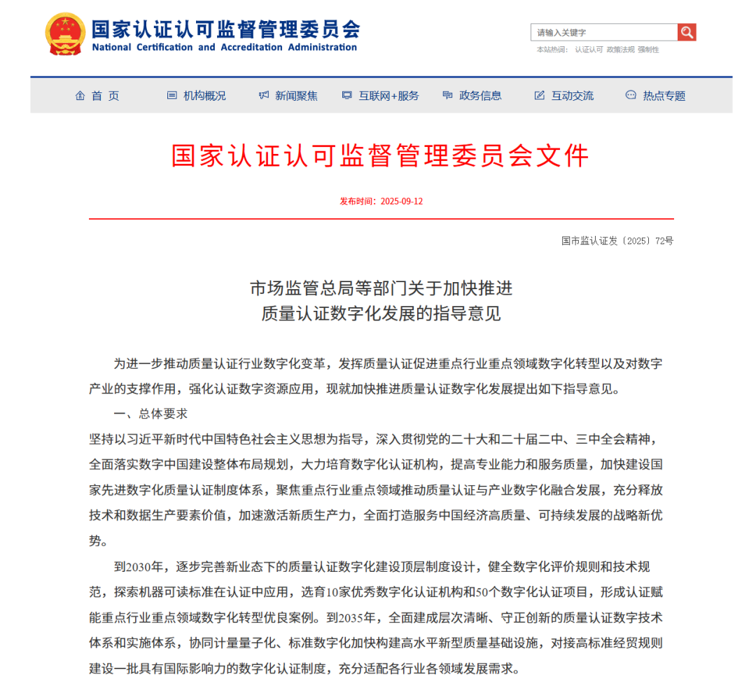 9月12日,市场监管总局等部门发布《关于加快推进质量认证数字化发展的指导意见》(以下简称《指导意见》)。《指导意见》提出到2030年,逐步完善新业态下的质量认证数字化建设顶层制度设计,健全数字化评价规则和技术规范,探索机器可读标准在认证中应用,选育10家优秀数字化认证机构和50个数字化认证项目,形成认证赋能重点行业重点领域数字化转型优良案例。到2035年,全面建成层次清晰、守正创新的质量认证数字技术体系和实施体系,协同计量量子化、标准数字化加快构建高水平新型质量基础设施,对接高标准经贸规则建设一批具有国际影响力的数字化认证制度,充分适配各行业各领域发展需求。《指导意见》主要包含五方面内容:一是推动认证机构和质量认证活动数字化发展。二是助力重点行业重点领域数字化转型。三是加大对数字产业的质量认证支撑力度。四是强化质量认证智慧监管和认证数字资源应用。五是构建质量认证数字化发展良好生态。