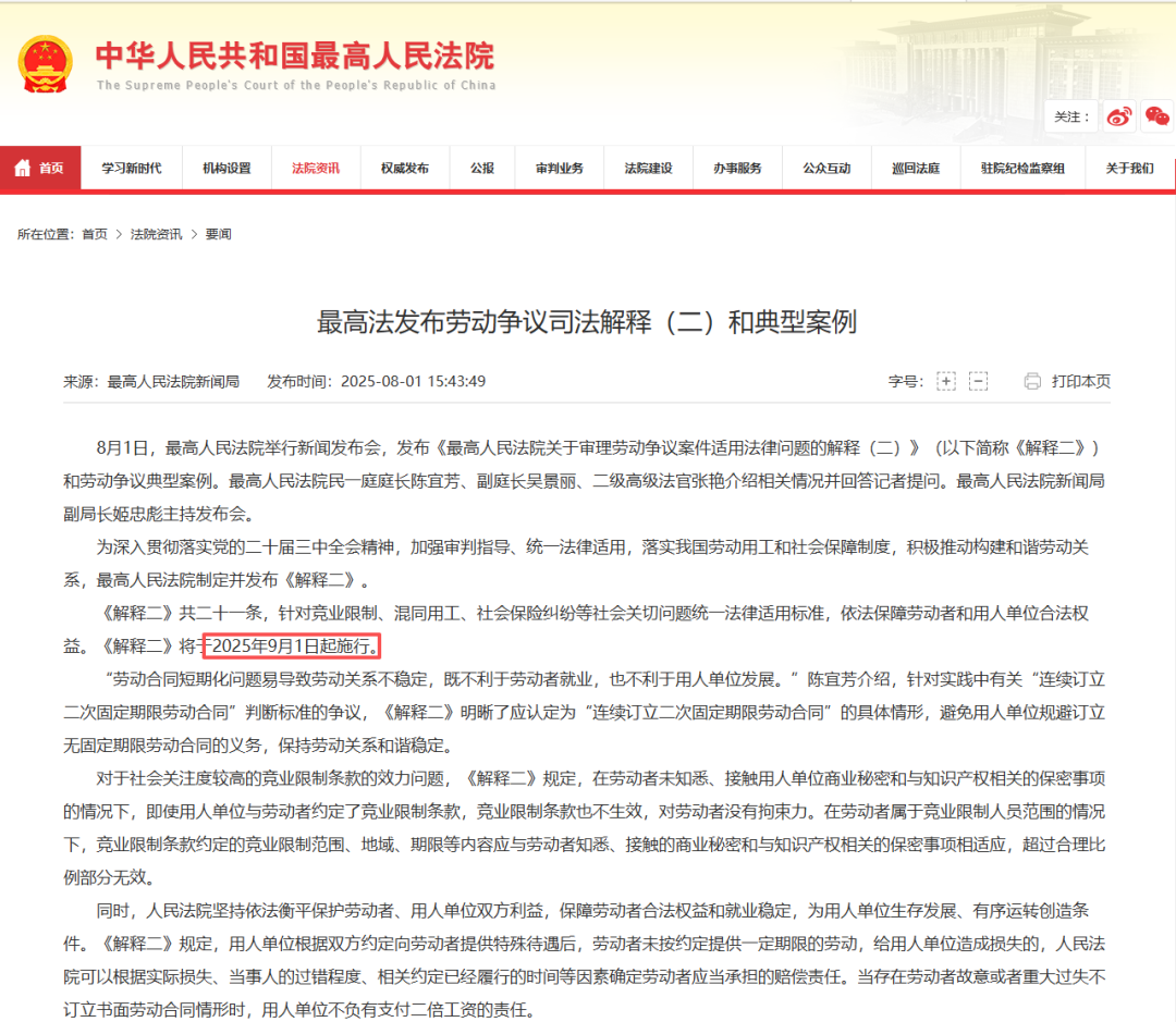 最高人民法院《关于审理劳动争议案件适用法律问题的解释(二)》自9月1日起 实施
